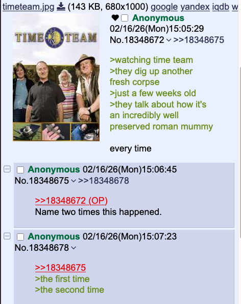 arrow-up14arrow-down1imageAnon likes archaeology showslemmy.worldkali_fornication@lemmy.world · 14 days agomessage-square0fedilink