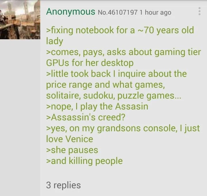 I have to wonder how pissed off this dude has to be every time he comes into his philistine son’s awful little home without a single crt. The fact that he’s willing to tolerate any of this goes to show how much he loves his son. That’s parenting goals.