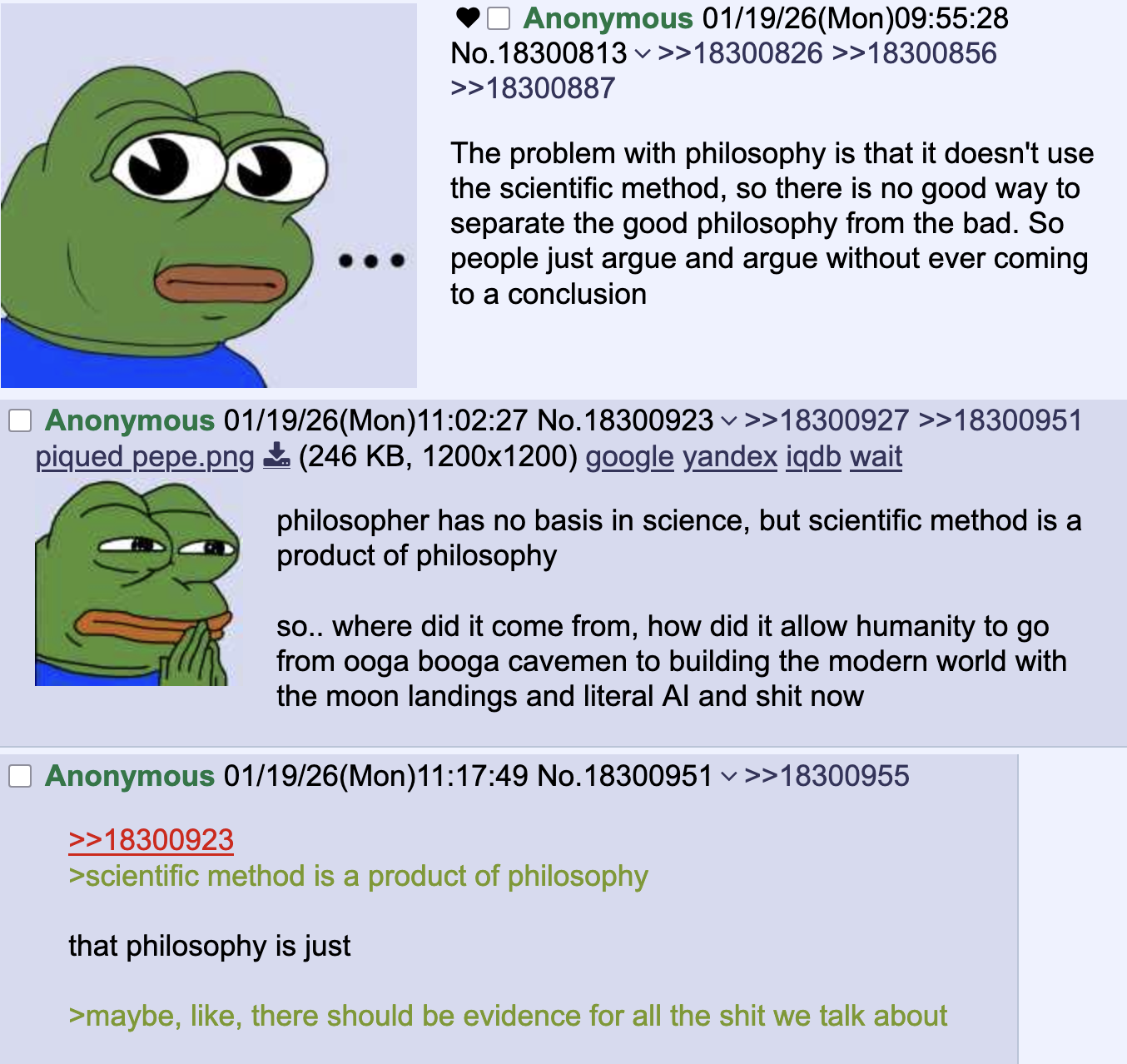 kali_fornication@lemmy.world to Greentext@sh.itjust.works · 1 month agoAnon gets philosophicallemmy.worldimagemessage-square2fedilinkarrow-up11arrow-down10