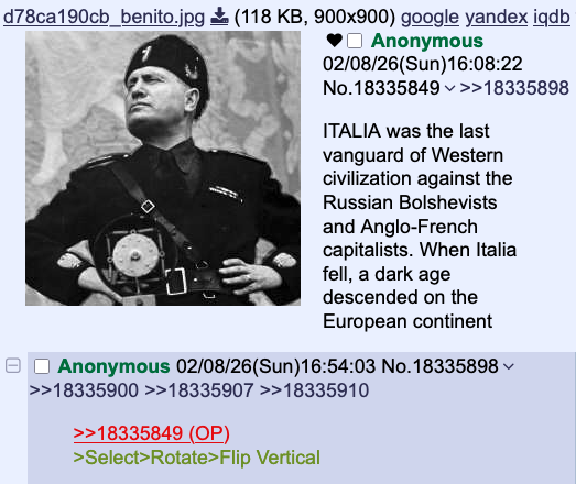 kali_fornication@lemmy.world to Greentext@sh.itjust.works · 22 days agoAnon on Mussolinilemmy.worldimagemessage-square5fedilinkarrow-up13arrow-down10