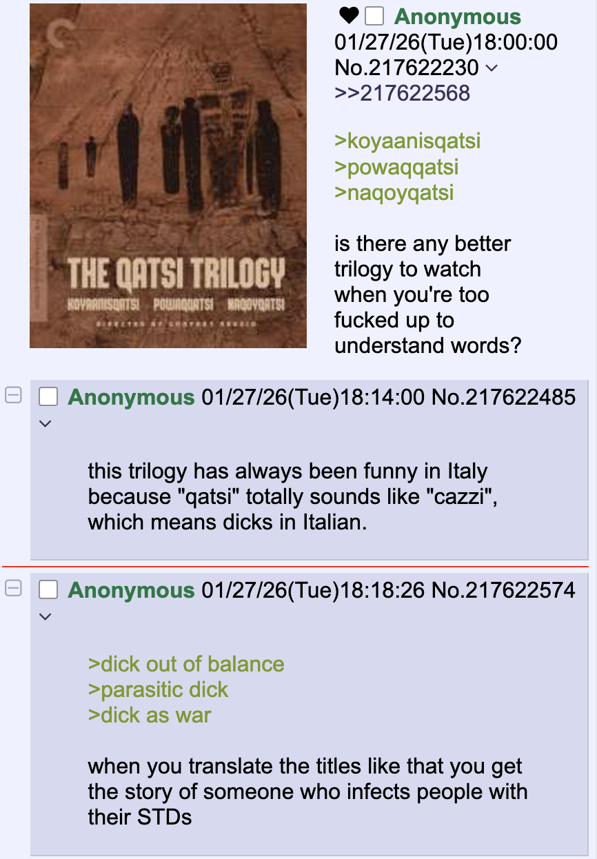 kali_fornication@lemmy.world to Greentext@sh.itjust.works · 1 month agoAnon recommends some movieslemmy.worldimagemessage-square3fedilinkarrow-up14arrow-down10