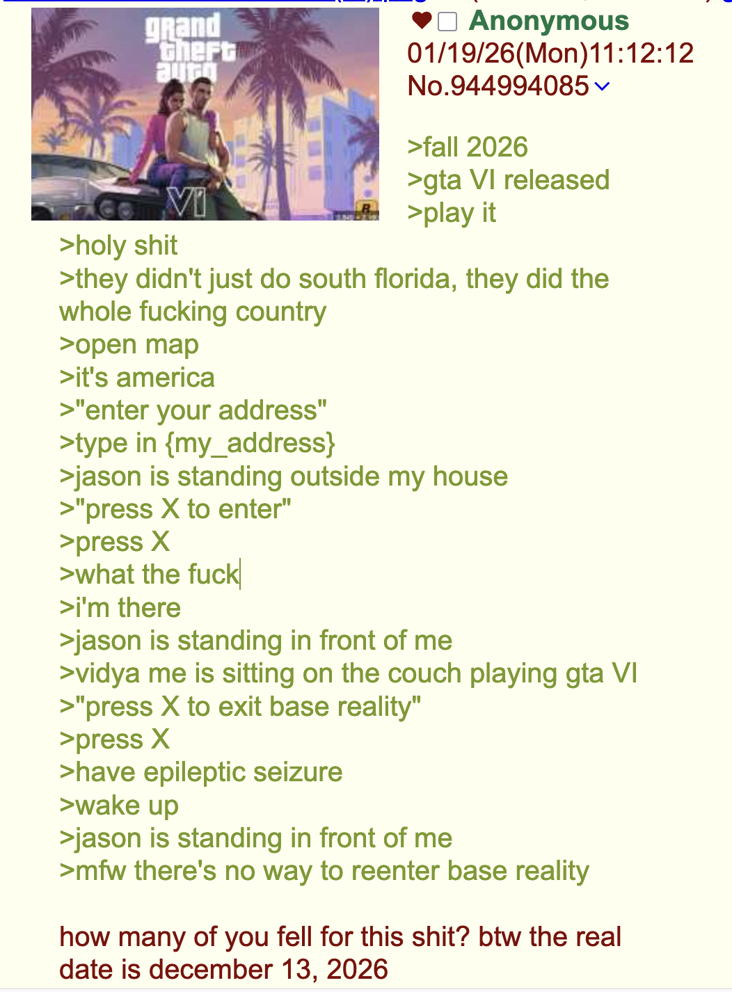 arrow-up12arrow-down1imageAnon plays GTA VIlemmy.worldkali_fornication@lemmy.world to Greentext@sh.itjust.works · 1 month agomessage-square0fedilink